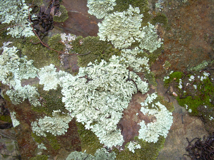 1. Xanthoparmelia somloensis al centro(credo poiché un po lontano sulla foto)et Flavoparmelia caperata o Flavoparmelia soredians alla cima. (distinzione chimiche : F.caperata KOH- ; F.soredians KOH + primo giallo poi rosso.) F. soredians con il tallo più applicato sul substrato.