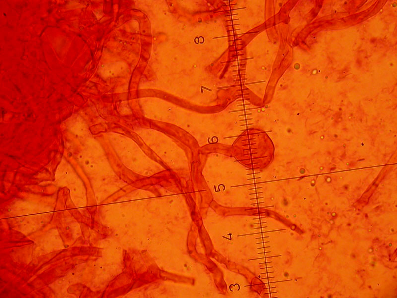 spore 10.5-13.5 x 8.5-10.5 micron, ialine, subglobose, largamente ellissoidali o francamente ellissoidali, di rado allungate, con parete sottile e piccole guttule oleose sparse, apicolo non del tipo umbrinolutea. Basidi in media 45-60 x 12-15 micron, tetrasporici, clavato-utricolati, banali per una Vaginatae; subimenio composto frequentmente da una cellula allargata basale sormontante una catena di cellule allungate ma spesso anche interamente composto da catene di ife allungate, giunti a fibbia assenti, proliferated clamps o pseudofibbie presenti; trama dell’imenoforo bilaterale, banale. Cellule marginali comuni, in clusters, catenulate, più raramente plurisettate, clavate o piroformi o sferopeduncolate, tipicamente piccole e larghe in media 18-28 micron, ialine, a parete sottile ma non facilmente collassanti. Rivestimento pileico composto, in superficie, da una spessa ixocutis di ife ialine intrecciate larghe 1-3.5 micron, pileipellis formata da un intreccio di ife cilindriche caoticamente intrecciate, larghe 3-15 micron, con numerose oleifere di medie dimensioni. Residui di velo sul cappello composti da ife cilindriche allungate, larghe 3-8 micron, sferociti rari o molto isolati, assolutamente minoritari. Sacco volvare alla base del gambo composto da un coacervo di ife cilindriche filamentose larghe 3-11 micron e sferociti di medio-piccole dimensioni (larghi in media 18-30 micron, al massimo 38 micron), cilindrociti rari o molto rari, tracce di gelificazione non viste.