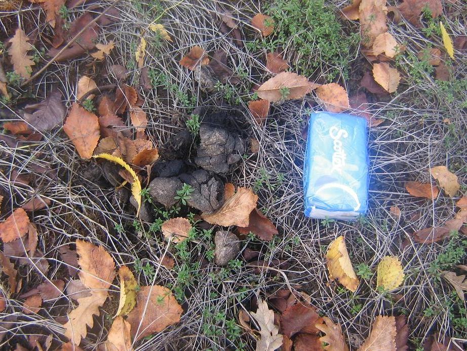 non sono freschi, ma erano sullo stesso piano a distanza due metri circa....mi pare che era un rifiugio, perchè intorno c'erano dei cespugli....ero in giro per il bosco con il cane, a certo punto il cane si era impazzito e si è ficcato in mezzo ai cespugli e io l'ho seguito, il mio cane era rimasto li ad annussare tutto il piano....e ho trovato delle feci.
