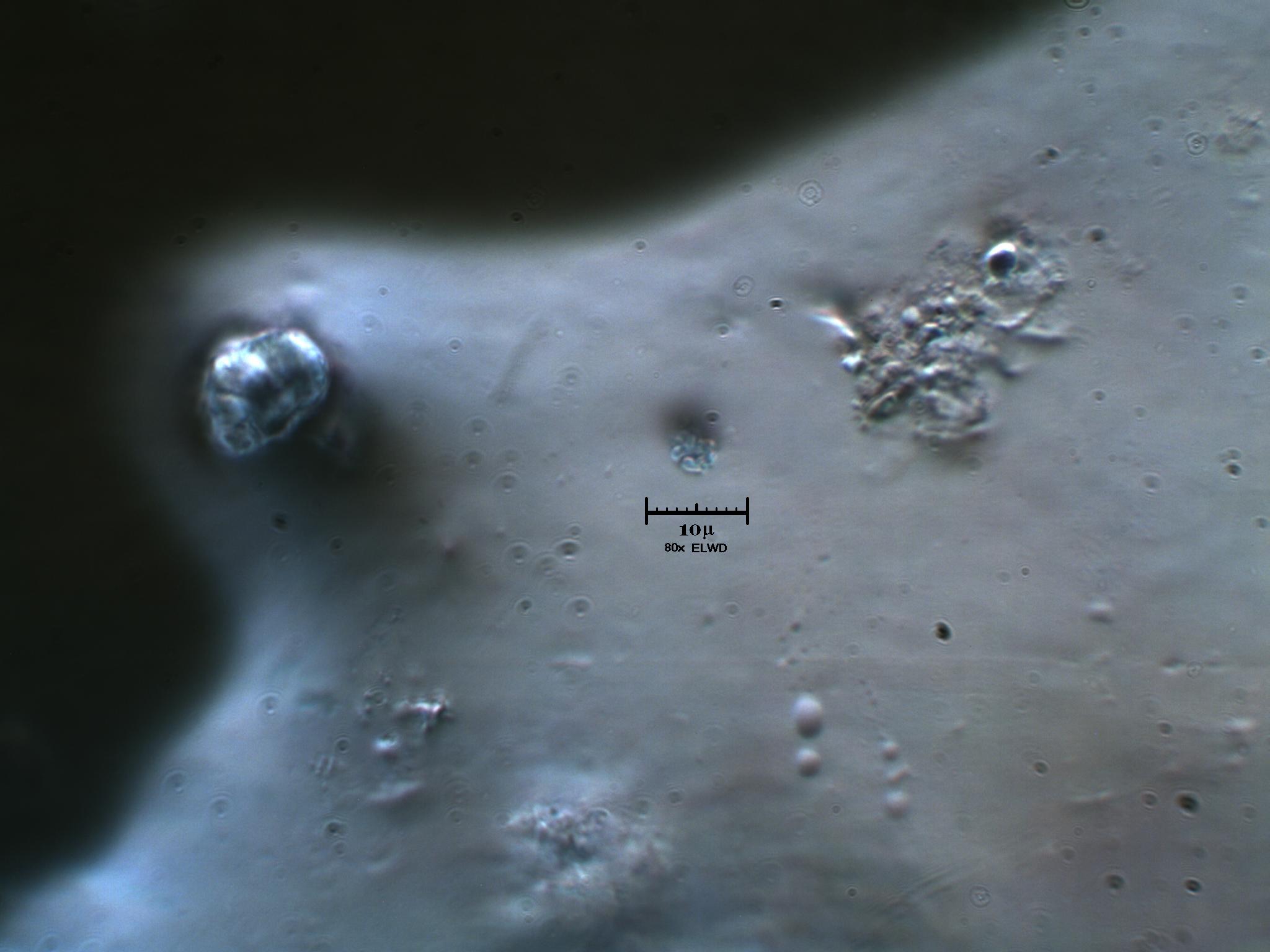 Stavo osservando col 10x senza coprivetrino una goccia del mio Lago di Ganzirri, allorchè mi accorgevo (parlo come un carabiniere?) di minutissimi puntini molto nervosi e veloci scorrazzare incessantemente qua e la. Mi sono chiesto: che cavolo sono? Batteri no, sembrerebbero flagellati o ciliati appena nati. Allora ho aspettato che uno di essi si arenasse in riva alla goccia, ho impostato l'illuminazione obliqua circolare (dovuta al campo oscuro inefficace per l'80x ELWD episcopico) e l'ho immortalato. Visualmente uno di questi "cosi" appariva come una massa gelatinosa ricoperta, o meglio farcita, di tanti foruncoli o bitorzoli o rigonfiamenti vari. Nessun flagello appariva alla vista nonostante la spaventosa risoluzione (circa 1/4 di micron) dovuta alla tecnica di ultramicroscopia. Qualcuno può dirmi qualcosa in merito? Si accettano anche ipotesi azzardate e fantascientifiche. NO MONNEZZA (giuro che è arrivato sparato prima di arenarsi).
