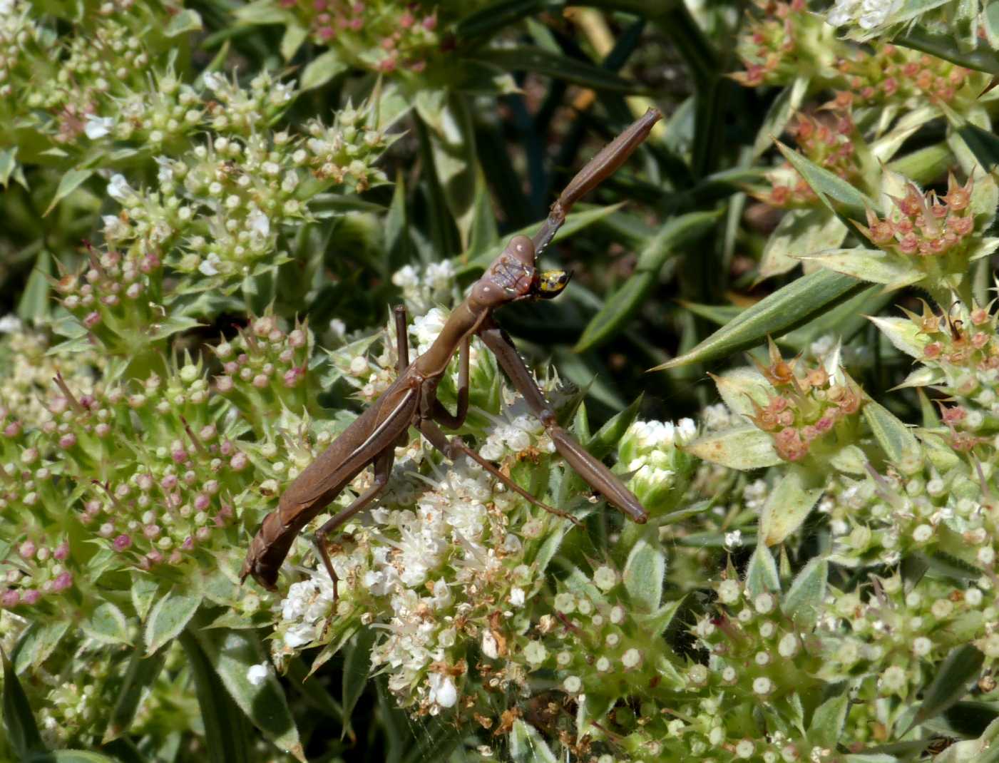 Nei cespugli di Echinophora spinosa, ormai quasi senza fiori, c'erano varie Iris oratoria, che pasteggiavano a base di imenotteri. Soprattutto Polistes, che, strano a dirsi, sono una preda molto frequente, anche di Mantis religiosa, e perfino un Pompilidae nero. A quanto pare il pungiglione non è un problema ......