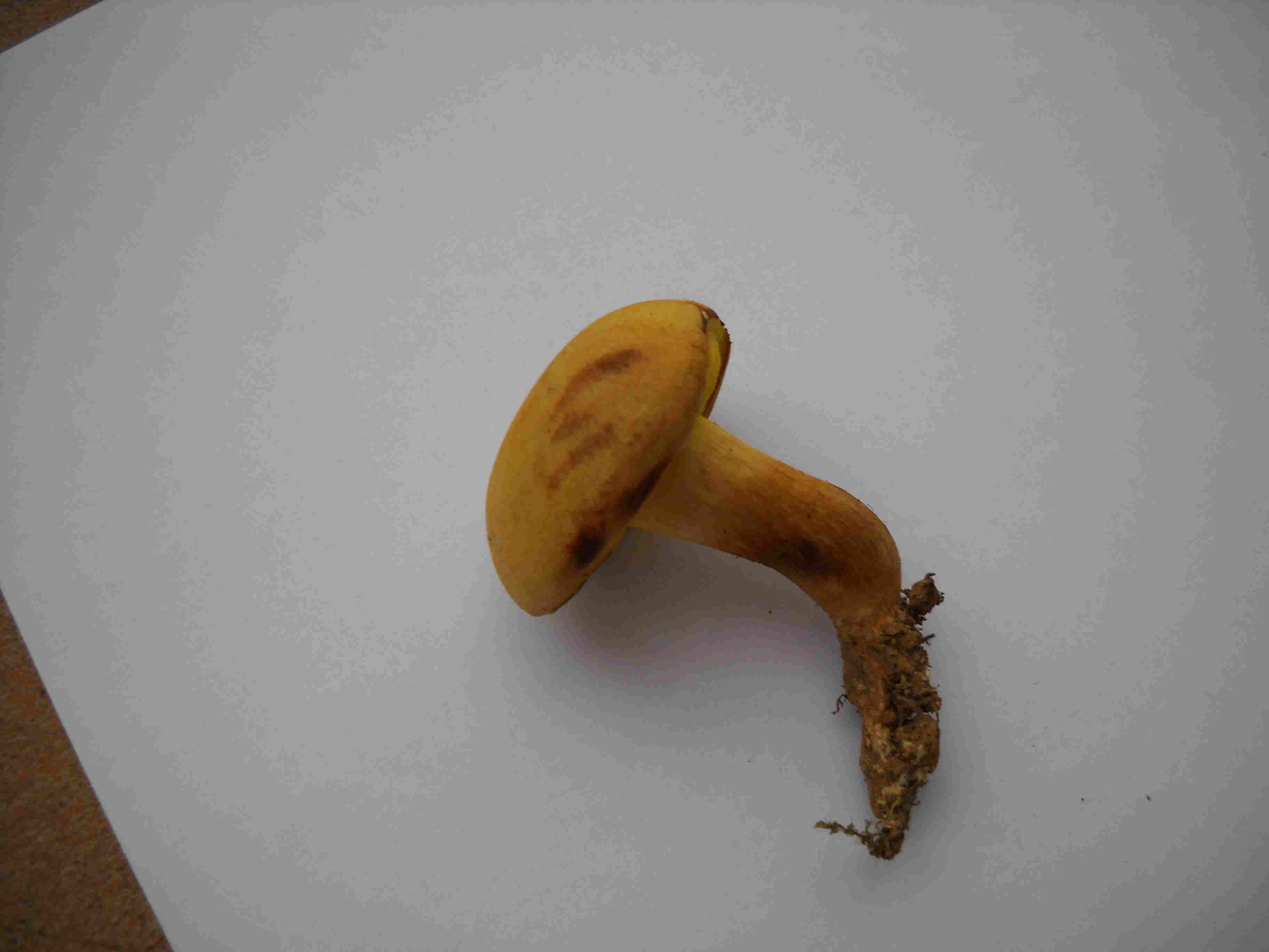 Cuticola vellutata, giallo verdognola, si macchia di scuro al tocco dopo un pò di tempo. Viraggio al blu piuttosto debole. Carne elastica. Odore quasi di cimice alla raccolta, il giorno dopo più da "porcino".