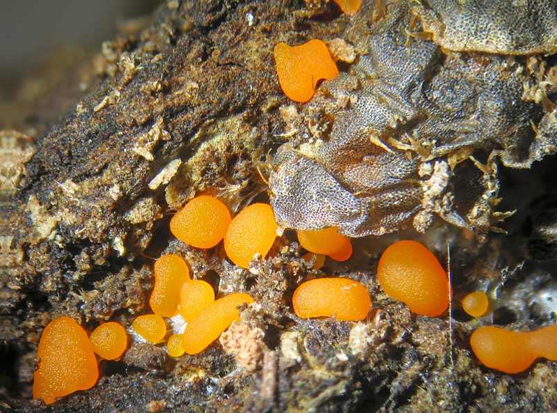 invece traferito in C.U.assieme ad un legnetto ospitante un Ascomicete comincia a girovagare e il 2 novembre gli sporocarpi si sviluppano sugli Apoteci gialli; le dimensioni delle immagini sono come in precedenza: