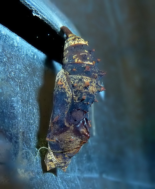 andando a guardare un po' di immagini in giro, Polygonia c-album dovrebbe avere delle macchie argentate che questa non ha, e anche Vanessa atalanta, non dovrebbe avere quei cornetti cefalici così a punta.... forse l'ipotesi di P. egea non è da scartare, anche perché la crisalide era completamente al buio, e l'effetto del flash ha esaltato/alterato i colori reali..comunque le specie che vivono lì in città non dovrebbero essere molte...chi sarà??? |