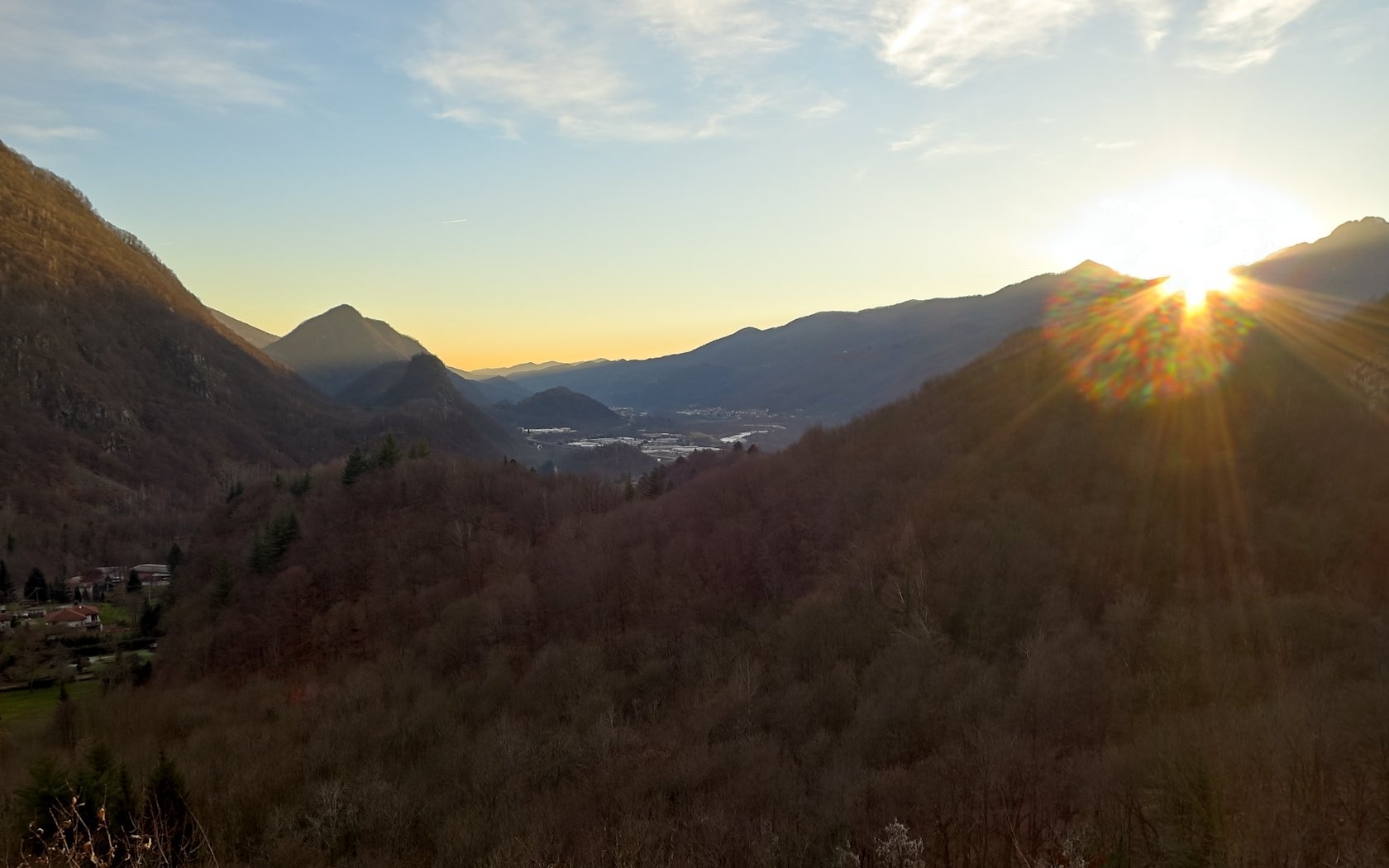Il sole tramonta tra Monte Tovo (a sx) e Monte Luvot (a dx)..