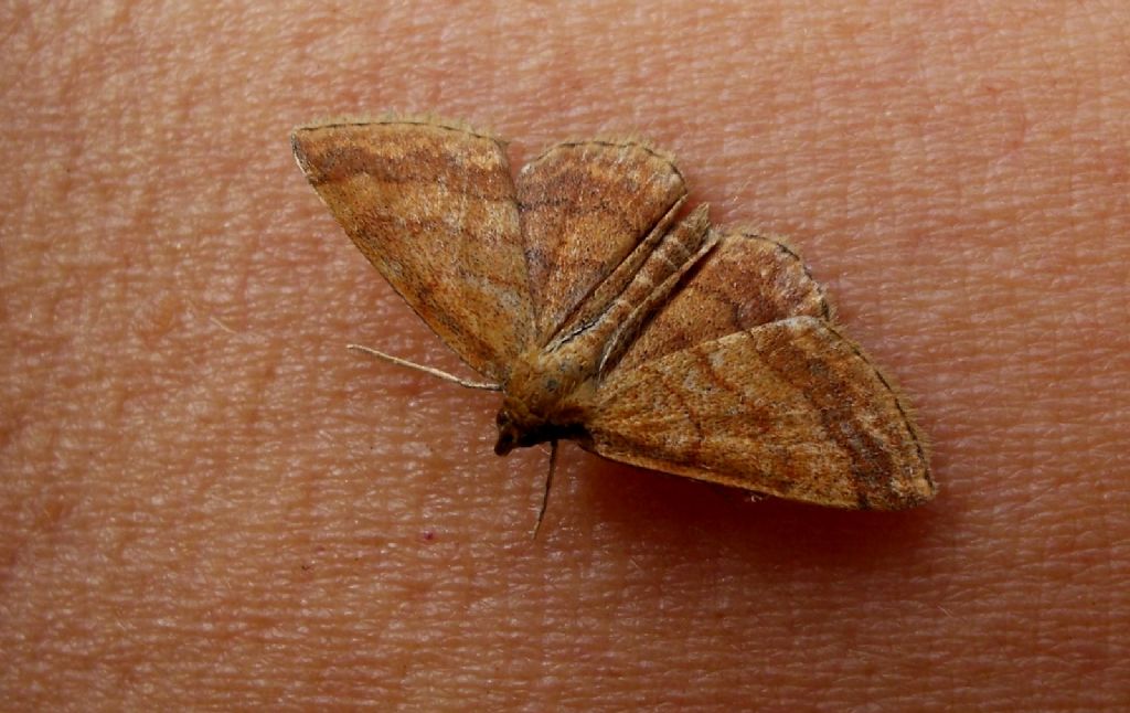 Era caduta in una tinozza d'acqua e l'ho presa pensando fosse già morta. Invece si è asciugata le ali e poi è volata. Padule di Fucecchio, ieri mattina. La mia ipotesi (certamente sbagliata) è che si tratti di una Scopula rubiginata, ma attendo il vostro responso. Grazie