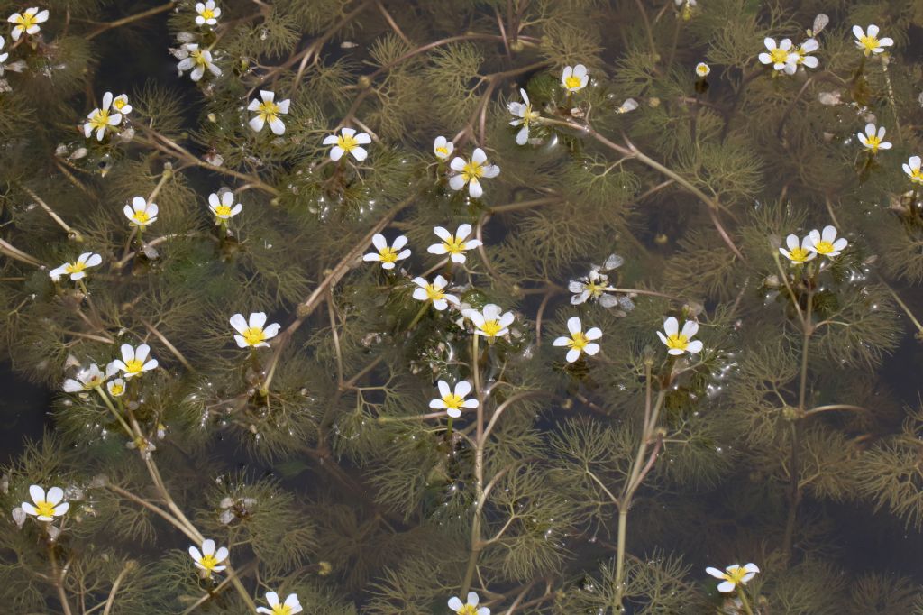 Con quanto mostra la foto esistono due possibilità, entrambe plausibili: o Ranunculus trichophyllus oppure Ranunculus circinatus. In Abruzzo è sicuramente presente il primo, mentre il secondo è dato come incerto. Personalmente, a dire il vero, propenderei maggiormente per R. circinatus. Se hai la possibilità di tornare, estrai un gambo dall'acqua: se le foglie si uniscono a pennello è R. trichophyllus, se invece sono più rigide e i filamenti restano divisi e aperti, allora saremmo di fronte a R. circinatus. Ma con la tua foto una certezza assoluta non possiamo averla. Riccardo |
