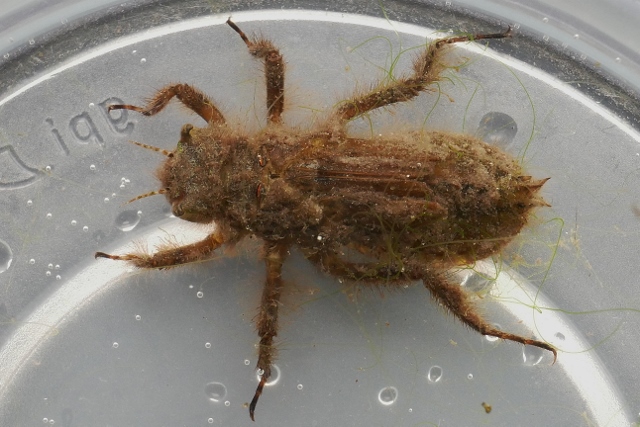 la confusione poteva evt essere con un Orthetrum (ma nessuna specie nostra corrisponde), non certo con un Onychogomphus, che ha struttura di capo e zampe del tutto differente (fra l'altro, non pelosi come questo), ha pteroteche ampiamente divergenti (non addossate sulla linea mediana come i libellulidi) e in più in un piccolo stagno da giardino sarebbe una presenza quanto meno insolita |