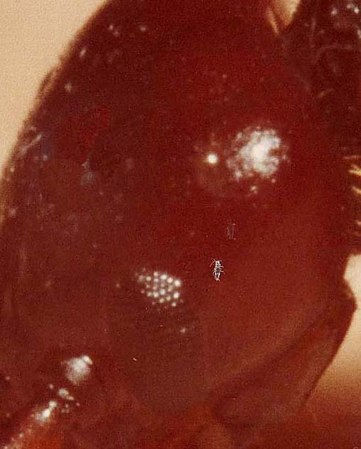 3) Gli spostamenti a cui ho sottoposto l'insetto per effettuare le macro successive hanno fatto cadere l'esuvia, ma intanto l'acaro si era spostato ed era entrato nel campo visivo dell'obiettivo.