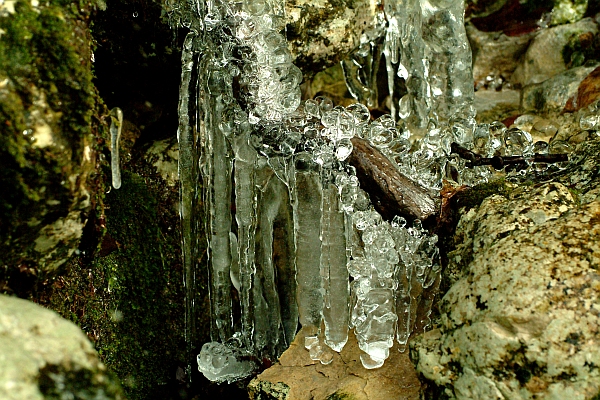 Queste formazioni di ghiaccio ricoprivano pareti alte anche 10 metri. Gli aspetti piu' suggestivi standoci vicino erano il rumore e il movimento che si percepiva al di sotto del ghiaccio. Infatti sotto il ghiaccio continuava a scorrere un filo d'acqua che trascinava con sè foglie colorate e detriti facendo apparire la parete in continuo movimento. Immagine:19