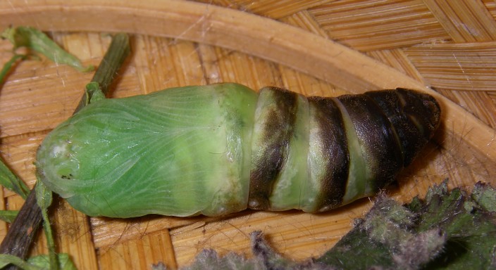 Molto bello questo reportage, non sapevo che il bruco di tale specie 'sgranocchiasse' le foglie! Io credo che sfarfallerà tra un paio di mesi! Tienici informati in caso di lieto evento!