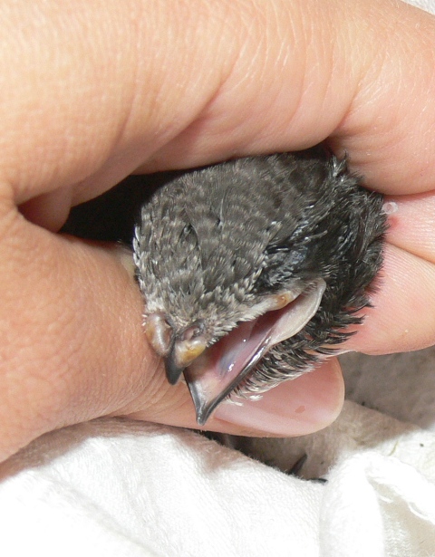 Ho trovato questo pullo di rondone con una strana escrescenza sul becco, vicino alle narici... Che cosa potrebbe essere?