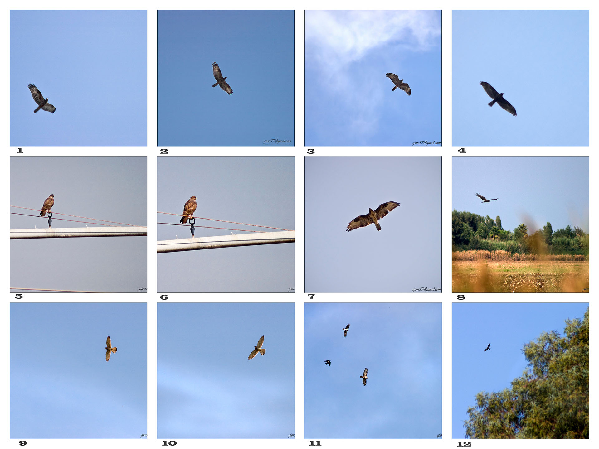 1) Pecchiaiolo (juv., a naso) 2) Pecchiaiolo 3) Pecchiaiolo 4) Falco di palude (jizz, ali lunghe, coda relativamente corta, colore nero uniforme) 5) Poiana 6) Poiana 7) Poiana (juv.?) 8) Falco di palude (marrone scuro con ali a "V") 9) Gheppio 10) Gheppio 11) Poiana (jizz e banda bianca sul petto) con Cornacchie grigie; 12) Falco di palude (struttura da Circus e testa gialla);