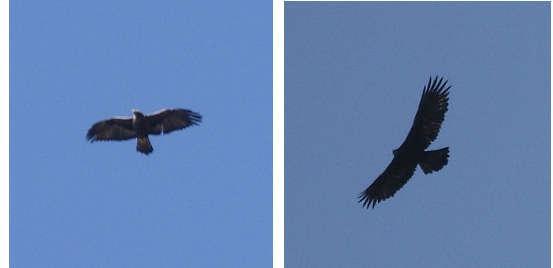 il mistero si infittisce!  Come ho descritto, i due uccelli sono rimasti sopra di me, senza allontanarsi per alcuni minuti (non stavano salendo in termica), e quando hanno deciso di andarsene l'hanno fatto insieme e si sono allontanati in tutt'altra direzione: direi quindi che erano della stessa specie. (Comunque nel territorio dove mi trovavo nidifica almeno una coppia di aquile: ho un libro con una foto di un nido) Ho trovato altre due foto ma non so quanto aggiungano di nuovo (sempre croppate) Immagine: