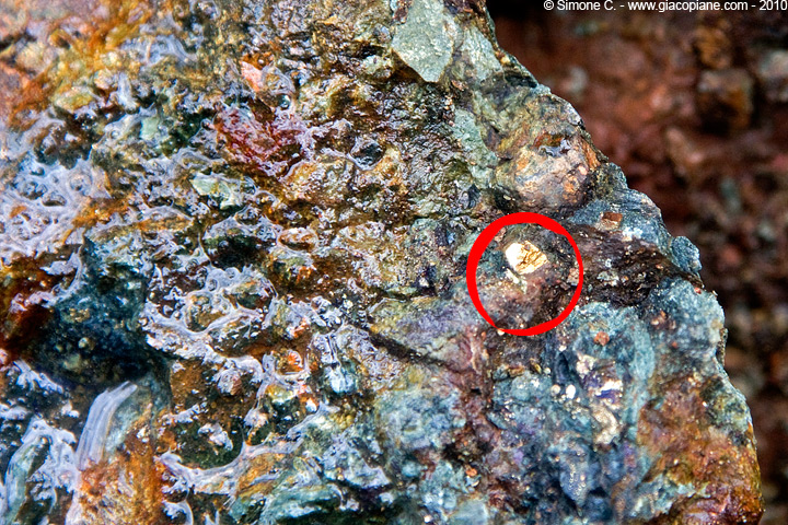 posto due foto, che mi potete dire della pietruzza giallo oro incastonata nella pietra? E su tutta la pietra? La pietra proviene, raccolta da terra, da una vecchia miniera abbandonata tanti anni fa, se ne è persa la memoria di che cosa fosse tale miniera. Parlando con dei vecchi, uno mi ha detto che forse era di rame, un altro di argento. Mah Si trova dalle parti del Parco Aveto in Liguria. Sul posto non so essere più preciso visto che si trova in una zona impervia in mezzo alla boscaglia, non ci sono nè sentieri nè segni per raggiungerla. (e anche sapessi esser più preciso non lo sarei di proposito per difendere sia il luogo sia gli anfibi che lo popolano).