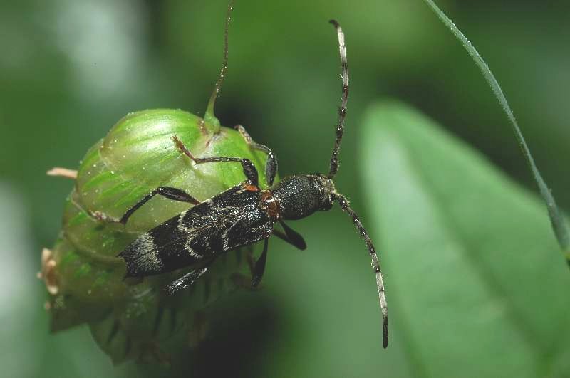 Si tratta di un Cerambycidae della Tribù Clytini, l' Anaglyptus gibbosus Una caratteristica che permette di riconoscerlo dalla specie molto simile A. mysticus è la presenza di una spina all'apice di ciascun elitra, che, schiarendo l'immagine, è perfettamente visibile. Dove lo hai fotografato ?