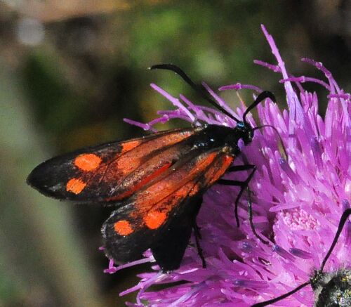 Mi sono scervellato e il risultato è che forse dirò una stupidaggine. Tutto il colore rosso che si vede apparire (in apparenza) sull'ala anteriore, è di fatto sull'ala posteriore ed è visibile per la trasparenza dell'anteriore consunta. direi trattarsi di una Zigena "a sei punti", forse filipendulae |
