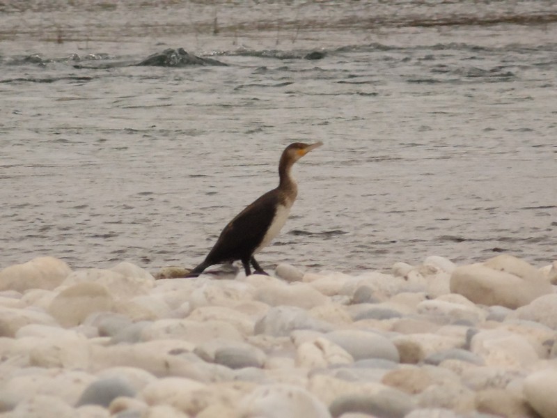 E' un cormorano, nella seconda foto sono presenti degli altri uccelli più piccoli forse sono Motacillidi, non avresti una foto dove si vedano anche loro?