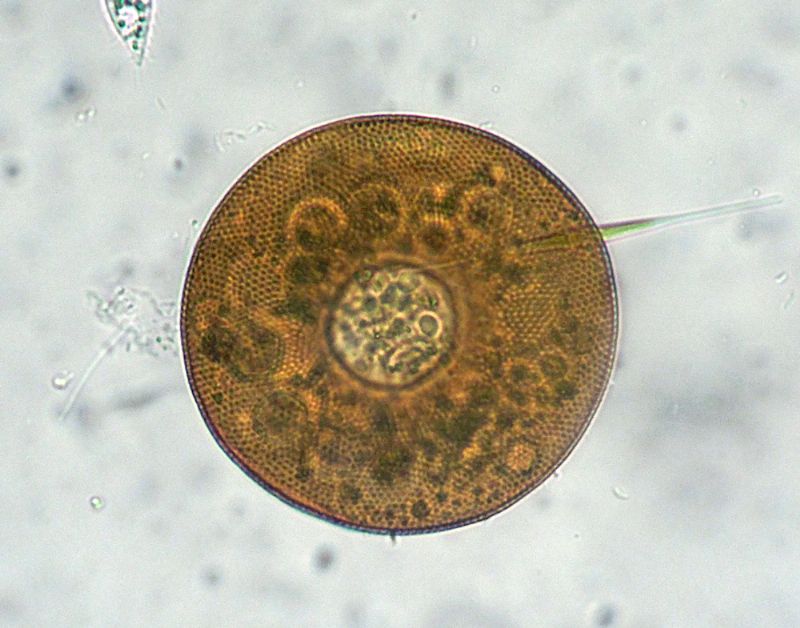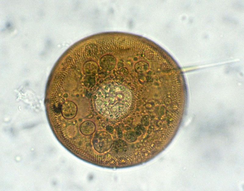 Tecamebe del genere Arcella. Il fuoco è centrato su più livelli per avere a fuoco la teca e l'animaletto ospite.