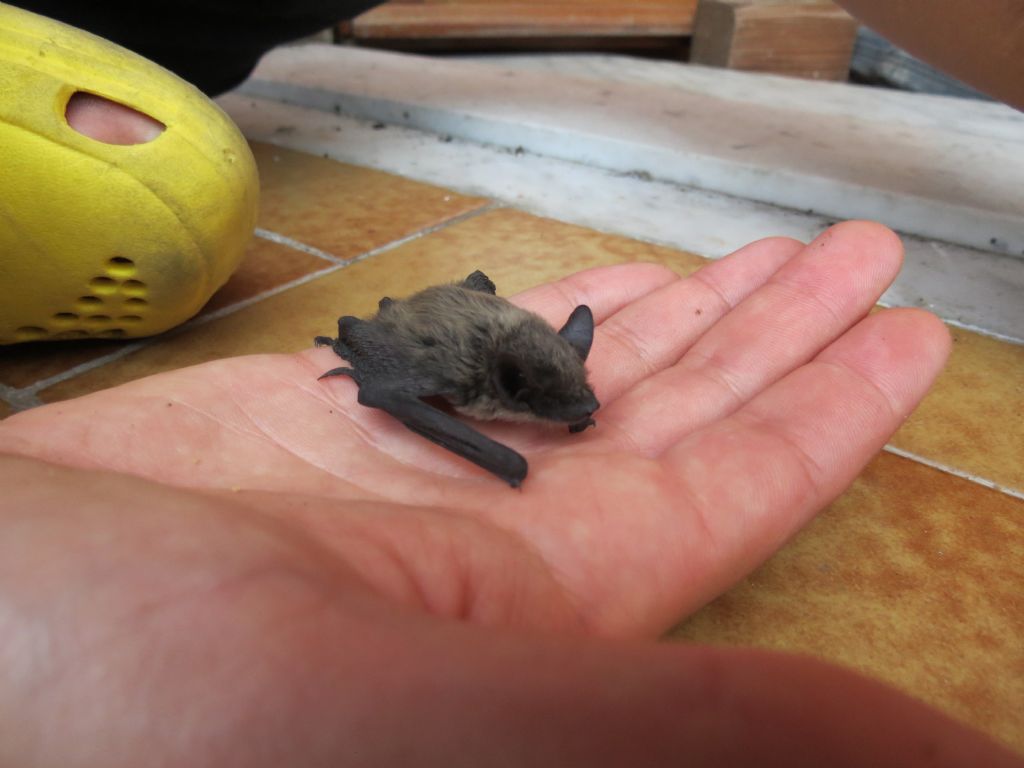 A occhio sembra Hypsugo savii solo perché si vede del pelo più chiaro sulla pancia e per la forma del trago che si vede male. Difficile escludere altri Pipistrellus. Per essere un cucciolo di serotino comune mi sembra piccolo e precoce.