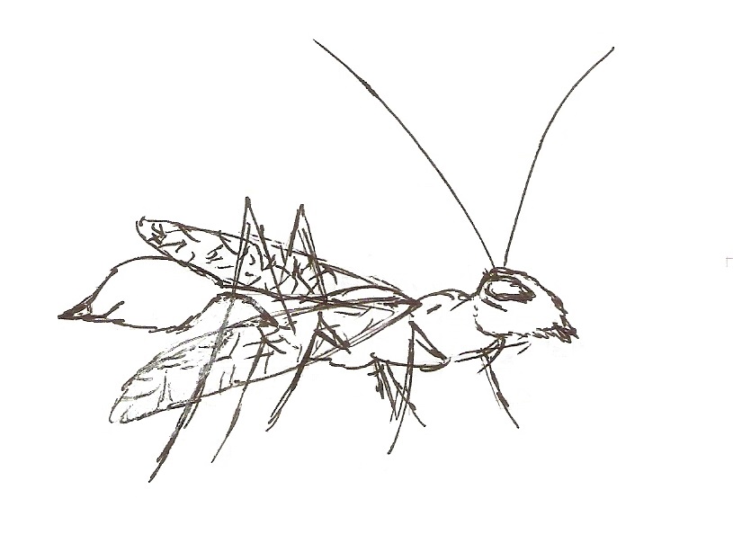 di colore nero, il capo era solito di un insetto solo che aveva due antenne belle lunghe, più o meno lunghe quasi quanto il suo corpo, toare bombato in 2 palline attaccate l'una all'altra, ali non molto grandi e strette, ma comunque gli consentono il volo visto che abito ad un settimo piano, le prime 4 su sei zampe ad una articolazione di eguale lunghezza, ma ora la parte più interessante è l'addome: le zampe posteriori erano simili a quelle di una cavalletta, più lunghe rispetto alle altre e che superavano il corpo nella loro estensione, l'addome era collegato al torace mediante un tubo stretto e sottile, infine l'addome si sviluppa in modo più corpulento con una punta alla fine (probabile pungiglione). Detto questo ora posto anche lo schizzo che ho fatto. So che non è molto ma mi farebbe piacere sapere che insetto è perché non l'ho mai visto in vita mia.