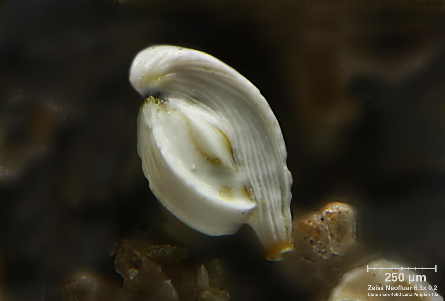 non è la conchiglia di un mollusco, credo sia una valva di ostracode ad ogni modo, complimenti per le foto! |