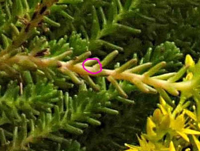 questo può essere uno sperone alla base di una foglia. In S. sexangulare vi è una piccola "linguetta" che si sviluppa più in basso rispetto al punto in cui la foglia è attaccata al fusto.