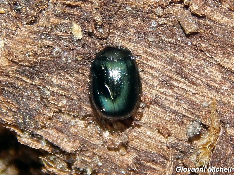 Dovrebbe trattarsi di Chrysolina varians anche se la taglia che citi è un po' piccola: forse 4,5/6 mm?