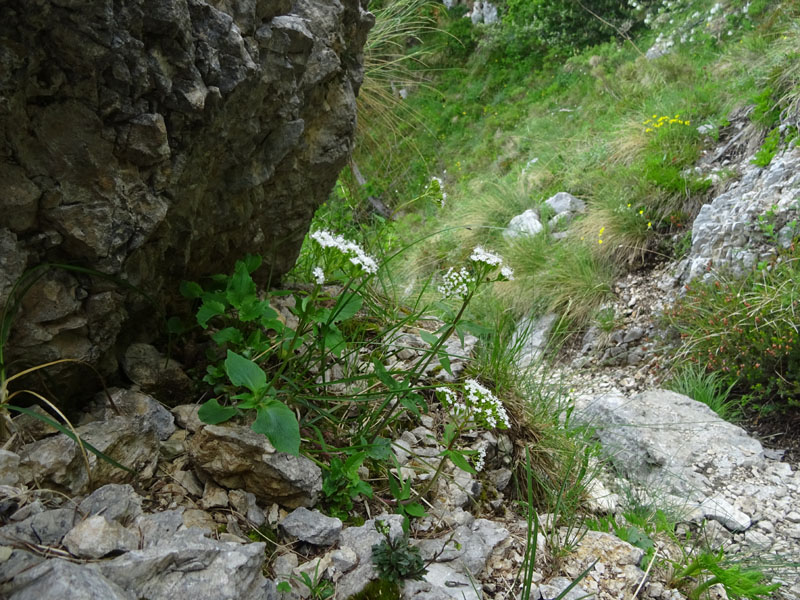 | Io penserei a Valeriana saxatilis, per i fiori decisamente bianchi, per l'andamento delle nervature che si intravedono sulle foglie basali e per il fatto che le foglie cauline inferiori sono picciolate, mentre le superiori non lo sono. |