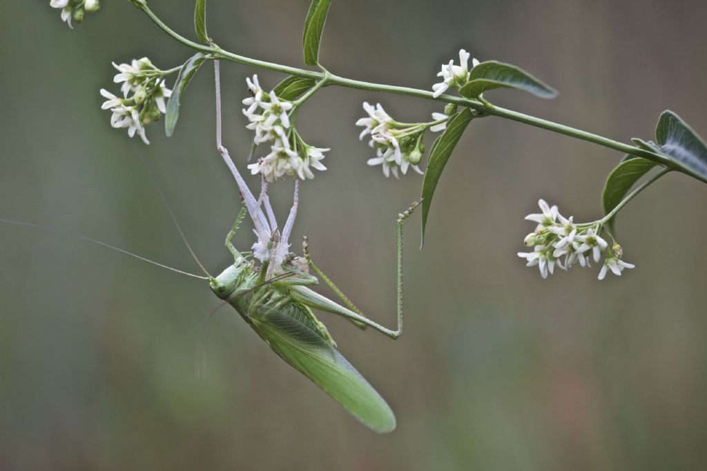 Non mi è capitato spesso di sorprendere gli insetti mentre mutano, o come questa Tettigonia mentre si nutre dei resti della sua exuvia, appesa ad un vincetossico.