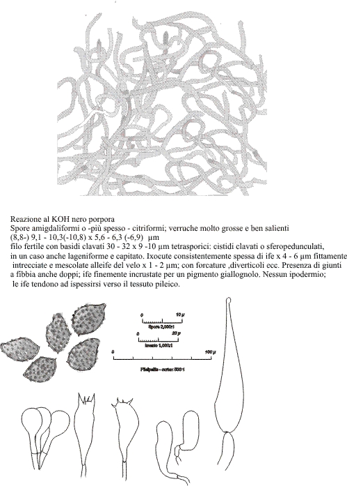 Cappello: ~ 3-8 cm. convesso, nell~adulto talvolta lobato; cuticola viscosa a umido, secca con tempo asciutto, separabile per 2/3, r ricoperta di un velo cospicuo di colore rossobruno (Ség.686), colore crosta di pane(Ség.191-193), nel giovanissimo verso il centro anche più rosato( Ség. 190)] giallo oro (Ség. 241) , fibrillosa, tendente a formare aureole, a margine a lungo involuto. Lamelle fitte, intersecate di lamellule e forcature terminali, filo finemente seghettato, annesse, di spessore medio, colore gialloverde pallido (Ség. 264-265), poi imbrumenti. Gambo: tozzo e corto (1/2 $ capp.), cilindrico, flbnlloso, gialloverde, più tardi con zona bluastra nella parte superiore (Ség. 269-270) con grosso bulbo marginato (2/3 e> capp.), talvolta fitonato-turbinato e profondamente infisso nel terreno. Veli: Universale da rosa a rossobruno-Parziale cortina abbondante e persistente, giallo zolfo( Ség. 275) Carne: soda, compatta, col. verde pallido - acquamarina (Ség. 330), nel cappello e nel gambo, con zone acquose nella parte superiore del gambo, più tardi bluescenti, nel bulbo giallognola (Ség. 260) Odore:inizialmente odore lieve di formaggio Camembert, poi più sgradevole, con fondo speziato. Gusto mite. Reazioni Chim. al KOH rossosangue o rosso popora sulla cuticola, rosa sulla carne; agli acidi gialla, nulla al solfato ferroso e al formolo. Polvere sporale: ruggine in massa. Spore: amigdaliformi o, più spesso citriformi, con verruche piuttosto fitte e non molto salienti: (8,8-) 9,1 10,3 x 5,6 6,3 (-6,9) µm, amigdaliformi, con verruche abbastanza fitte e non molto rilevanti Imenio: filo fertile Basidi:clavati, tetrasporici 30 32 x 9 10 µm, cistidi clavato o sferopedunculati, trovato anche uno anormale lageniforme e capitato. Pileipellis: ixocute spessa di ife x 4 6 µm, fittamente intrecciate e miste alle ife del velo x 1- 2 µm, sovente forcate, diverticolate, ecc.giunti a fibbia, anche doppi, presenti;. ife incrostate da un pigmento giallognolo. Ipodermio assente,ma le ife tendono ad ingrossarsi negli strati inferiori.