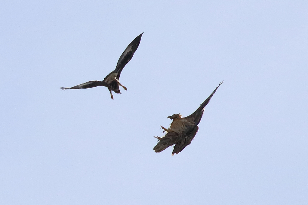 Altro giorno. Una coppia di individui di cui un immaturo e un subadulto (o un "quasi adulto") ha volteggiato per qualche minuto sopra l'area in cui mi ero appostato, ma tenendosi sempre a distanza troppo elevata per foto di qualità. Giovane, crop abbondante.
