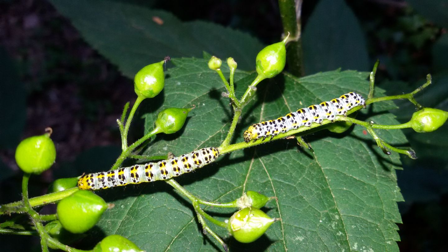 Ti stavo rispondendo di getto Cucullia (Shargacucullia) scrophulariae, dato che la pianta è una Scrophularia e le due larve sono molto contrastate, ma ho l'impressione che il carattere distintivo principale tra le larve di scrophulariae e verbasci sia la (quasi) assenza nella prima e la presenza decisa nella seconda di tutta quella serie di macchiette nere tra i segmenti in aggiunta a quelle più grandi confinanti con il giallo.