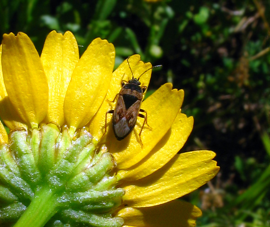 Foto 2) Rhyparochromus (Xanthochilus) minusculus (Reuter, 1885). Specie più meridionale rispetto all'affine R.quadratus. Generalmente ha una macchia scura estesa sulla membrana, mentre R.quadratus l'ha appena accennata. Altri caratteri sono nella disposizione dei punti nel clavo (qui non si vedono). R.saturnius assomiglia molto a entrambe ma è più grande e di forma più "ovale". (vedi richiami in "Tassonomia")
