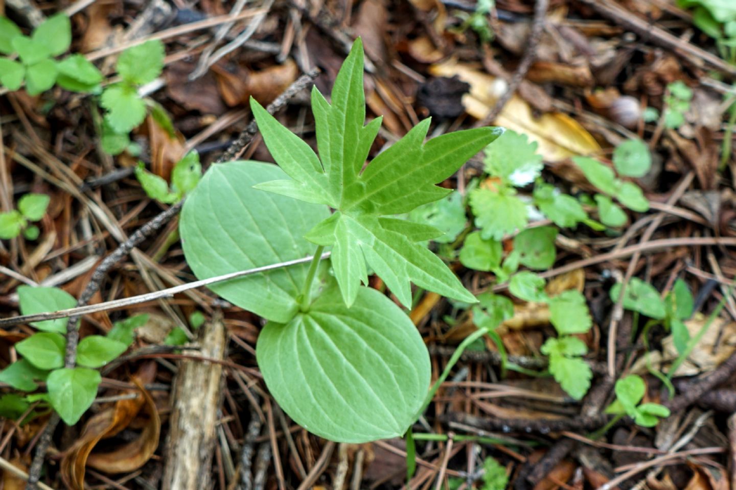 | Parrebbe una plantula appena germogliata. Quelle "foglie" sotto sono i cotiledoni, mentre quella sopra, centrale, è una foglia dalla forma già più normale. Difficile riconoscere la specie in uno stadio così giovanile. Acer sp.? Non saprei con certezza. |