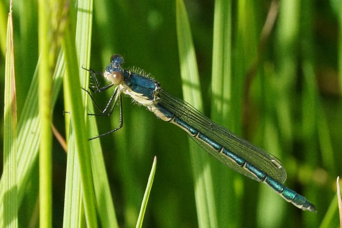Sicuramente un Lestidae. Lo pterostigma rettangolare con bordi bianchi mi fa pensare ud un Lestes virens, ma alcune cose non tornano. Spero non sia ancora un Chalcolestes.