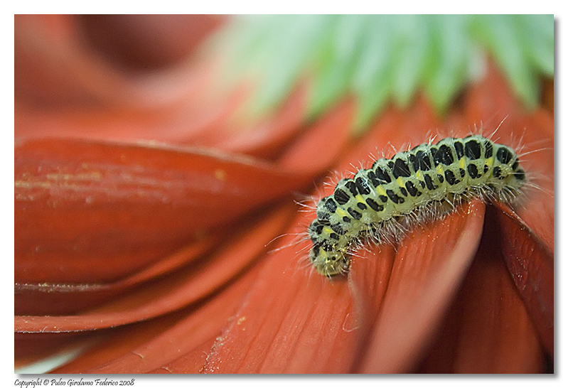 Un saluto ed un benvenuto a Federico, mio conterraneo, a quanto vedo  Non preoccuparti, questo bruco può essere pericoloso solo per chi lo mangia (uccelli e simili)  Si tratta infatti della forma larvale di Zygaena filipendulae, che si incontra comunemente, in questo periodo, lungo la costa rocciosa intorno a Palermo, dove cresce la sua pianta nutrice (Lotus cfr. creticus). I rappresentanti di questa famiglia contengono sostanze, tossiche per i predatori, in tutti gli stadi del loro ciclo vitale. Se vuoi vedere numerose foto del bruco e come diventerà "da grande", puoi guardare questa discussione, da me inserita un paio di anni fa.