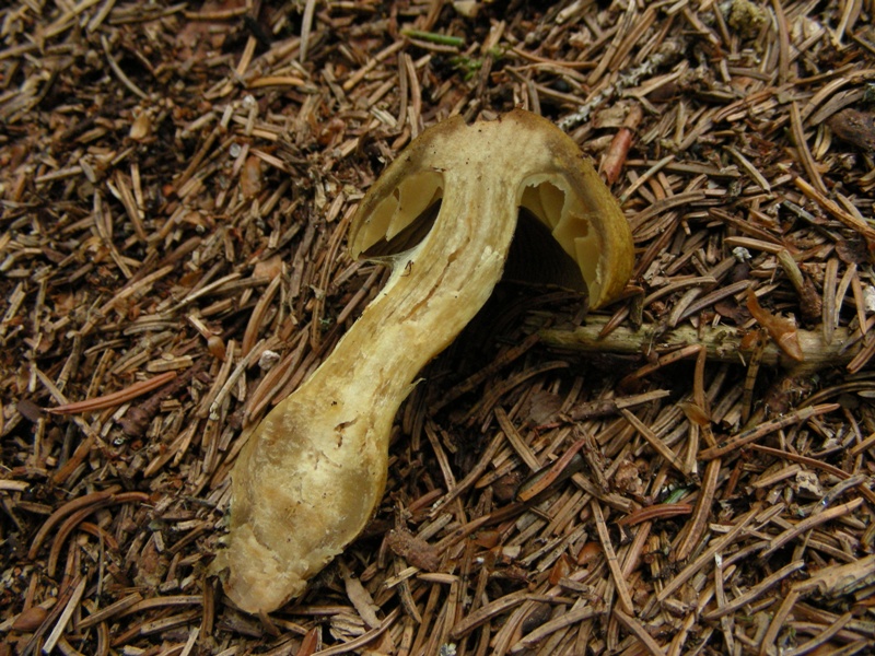 3)Altro cortinario per me non ancora identificabile, caratterizzato da un portamento tozzo con gambo ingrossato alla base, assenza di odori e carne bianca, leggera, alla compressione il gambo appariva quasi incosistente, gonfio: