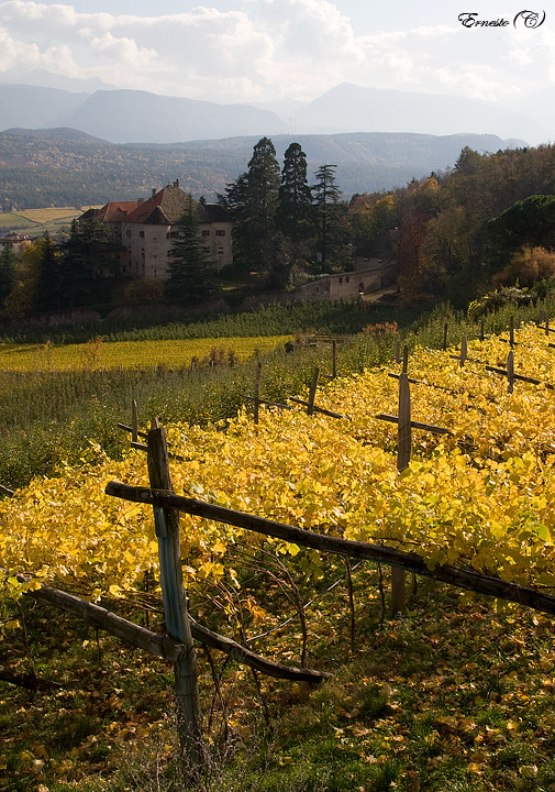 nei pressi di Bolzano,intorno al lago di Caldaro si trova una zona collinosa adatta per la coltivazione delle viti da cui nascono rinomati vini, questa zona e costellata da antichi castelli,chiese e vecchie residenze nobiliari, in autunno con l ingiallimento delle foglie di vite assume una particolare bellezza a tutti un saluto