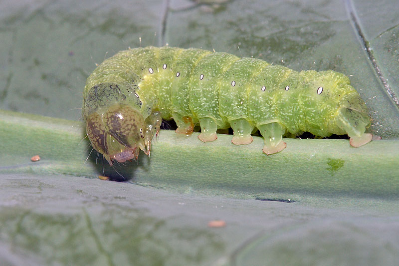 Il bruco della seconda foto si è appena felicemente interrato; durante l'operazione di pulizia ha lasciato la foglia di cavolfiore e ha trovato la terra, dirigendosi a capofitto. Volevo misurarlo ma non c'è stato il tempo, credo comunque che superasse i 5 cm quando disteso.
