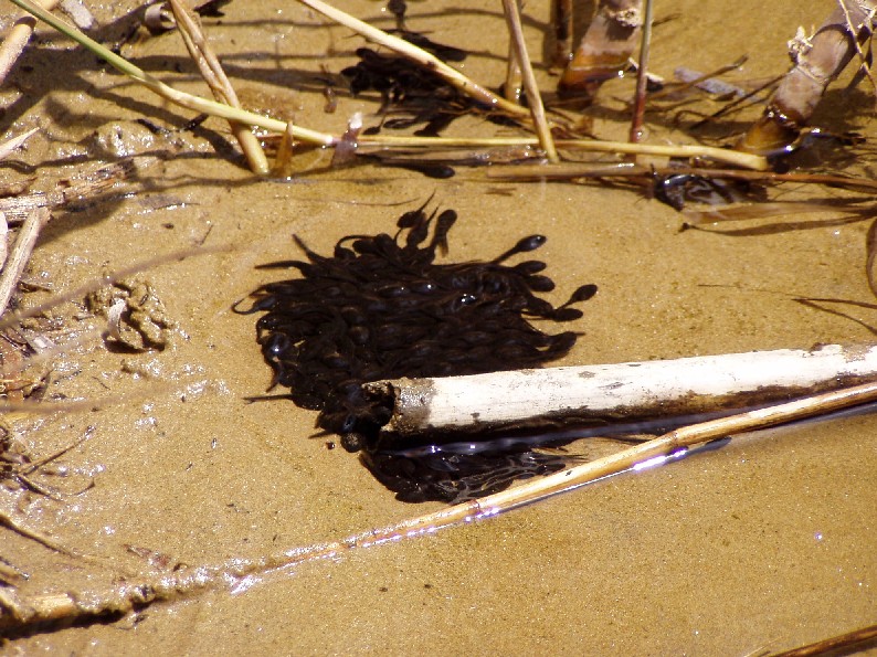 Non si tratta certo di luoghi spettacolari, ma possono riservare delle sorprese. Siamo a pochi metri dal mare... nel mezzo del Golfo di Baratti (a meno di un chilometro dal fontanile del Pozzino, descritto nell'altra discussione). Baratti è famoso per il mare e per il Parco Archeologico di Baratti-Populonia, ma per noi amanti degli anfibi presenta sorprese interessanti. Vi sono due fossi che confluiscono in mare, in estate asciutti, ma che in inverno, attraversata la pineta, solcano la spiaggia con acqua corrente. Uno è il Fosso Valgranita, più vicino alla zona archeologica, che passa accanto ad uno ampio stagno inaccessibile dai rovi e le cannucce di palude che lo soffocano. Questo fosso è quasi sempre alimentato da acqua. In piena estate l'acqua non scorre quasi più è in corrispondenza della spiaggia rimane solo sabbia asciutta, ma pochi metri all'interno, fra il canneto, un po' d'acqua rimane in alveo...  L'altro fosso, nella parte centrale del golfo, vicino al pratone, è il Fosso della Focecchiola, più grande, ma che tende a seccarsi con più facilità...  Ebbene nel Fosso Valgranita si possono osservare a primavera i girini di rospo comune, in quello della Focecchiola, quando l'inverno è stato sufficientemente piovoso, quelli di smeraldino! In entrambi ho rinvenuto anche rane verdi, che comunque non sono dominanti, nonché qualche piccola anguilla. Libellule e rondini fanno, nel periodo consueto, da contorno. E' da anni che saltuariamente faccio monitoraggio in questi due ambienti, ma di foto ho trovato solo quelle di questo 2009 e qualcosa dell'anno scorso. Cercherò di illustrare il tutto nel modo più eloquente possibile... Qualche immagine sarà dedicata anche alla sporcizia che ogni tanto si rinviene in zona: la coscienza ecologica viene prima di tutto!