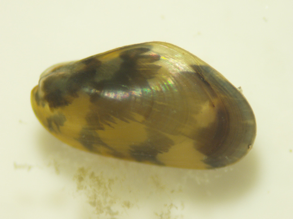 Per un puro errore personale (così giusto per non prendere meriti) ho messo degli Xenostrobus securis in liquido conservante (corrosivo) e poi ho volutamente ripetuto l'esperimento con la candeggina a casa. Gli esemplari in questone sono Xenostrobus perchè Xenostrobus sotto il periostraco nero (difficile da eliminare in natura, eh) presenta strie a zig-zag come i tuoi esemplari. Non ci avrei mai scommesso su di una colorazione del genere di Xenostobus, naturalmente da giovanile quando il periostraco è rado e non forte