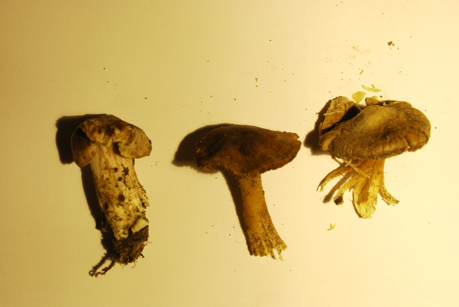 Il giorno dopo sono passato di la a vedere se c'era qualcosa che potesse essere potenzialmente tossico, tipo tracce di veleno per lumache o per topi oppure funghi etc e ho trovato diversi funghi di varie taglie tutti piuttosto piccoli. Uno di questi era proprio alla base delle siepe, strappato e mancante del "cappello". Stasera sono andato a raccogliere tre funghi nello steso luogo e chiedo a voi se potete determinarli e stabilire se sono tossici e se possono essere stati la causa dell'intossicazione. Lo so non cambia nulla, ma è per togliermi un assillo.