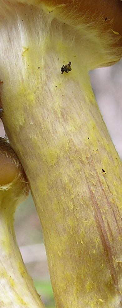 Io non riesco a vederci niente di diverso da Armillaria gallica, non solo per il gambo sulla destra, ma per le scaglie che si intravedono sul cappello sulla sinistra...il colore, lo spessore del gambo, i due esemplari che sembrano connnati (immaginando la continuazione dei gambi si capisce che si uniranno), la cortina (che ho rinvenuto spesso in questa specie)...coincide proprio tutto tutto (fino ad ora)