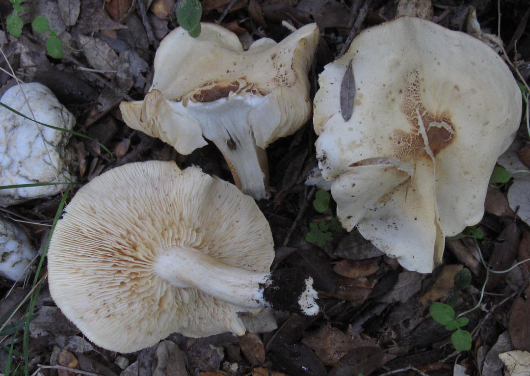 Habitus da tricholoma e per tonalita' rossastre che intravvedo nelle lamelle e verso la fine del gambo,penserei a T.saponaceum ,l'odore forse verrebbe fuori allo strofinio,noto delle guttule carateristiche sul pileo- Tricoloma pseudoalbum avrebbe secondo me non delle macchie del tipo rsppresentato ed odore terroso per ed un bordo pileare differente. Per il tricholoma grigio Gr.terreum. Per il Cortinarius? passo, Gentile |