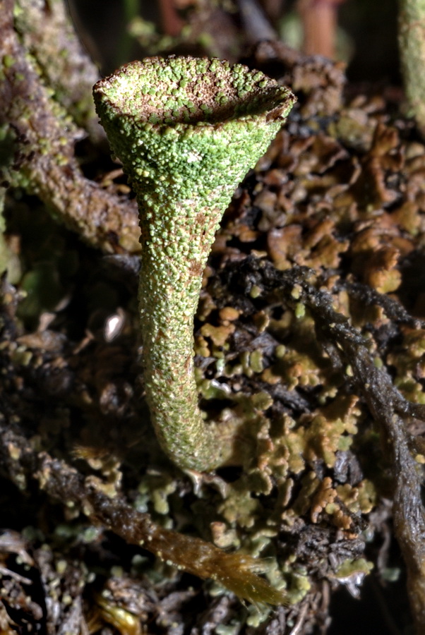 ....è una Cladonia, ma non è C. fimbriata anche se la forma dei podezi ci assomiglia. Cladonia fimbriata ha le coppe coperte da soredi sottilissimi, farinosi, mentre questa qui è coperta di verruche corticate (che nono sono veri soredi) e quindi appartiene al gruppo di Cladonia pyxydata. Le squamette basali si vedono benissimo: sono molto caratteristiche: grosse e marroni. Io propenderei per un esemplare particolarmente "snello" di Cladonia pocillum... ciao a tutti PL |
