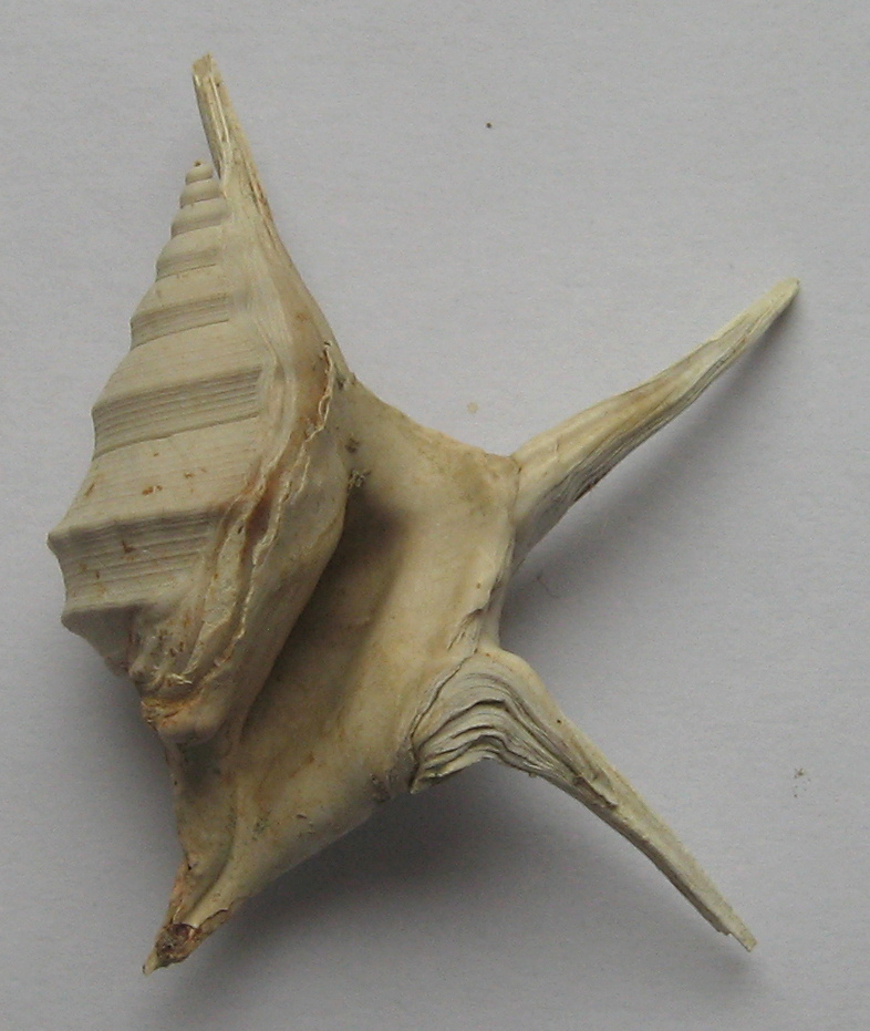 Si tratta indubbiamente di Aporrhais huttingerianus, un esemplare con digitazioni particolarmente sviluppate e rappresentata abbastanza raramente nel Pleistocene, riguardo alla forma elegantissima non ho trovato menzione relativa a questa specie, bensì ad un Aporrhais elegantissimus descritto da Parenzan e poi riunito alla sinonimia di A. pespelecani. Questo presenta spine molto lunghe, delle quali, la prima verso l'apice, però decorre staccata dalla spira. Delle tante varietà e specie descritte in funzione dello sviluppo delle spire, penso molte siano da riferirsi a morfotipi cresciuti in ambienti diversi che ne hanno influenzato la crescita. Ciao.