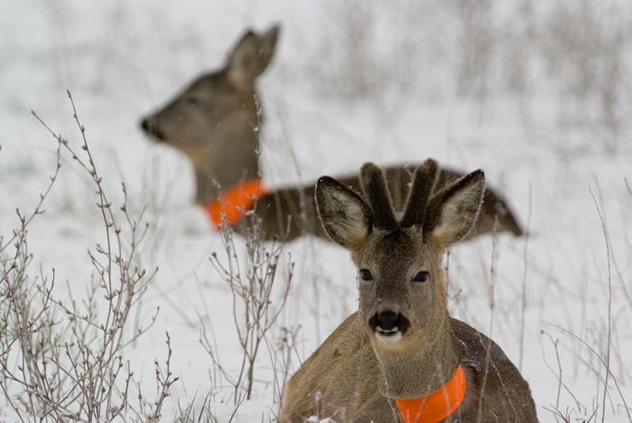 A me viene da pensare a capi raccolti da piccoli e poi reintrodotti successivamente, la fascia visto che sono molto confidenti e non abituati ai rischi, per evitare il tiro dei cacciatori, altrimenti non passerebbero il primo avvistamento.