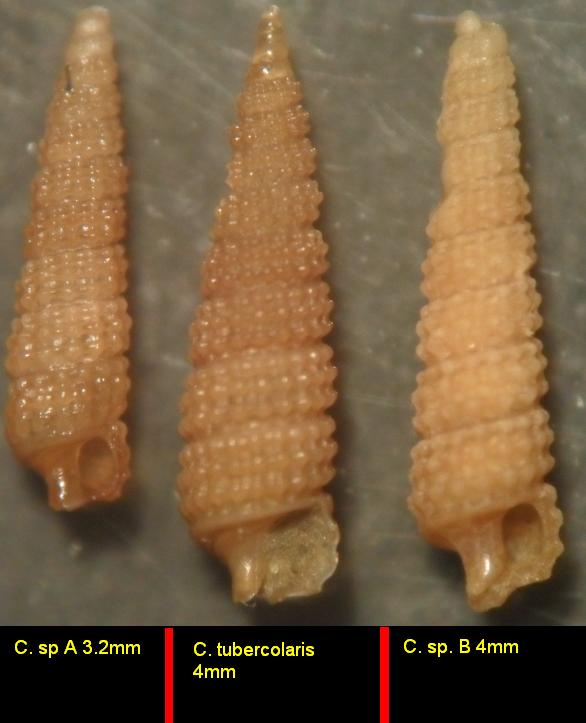 esemplari A e B rispettivamente di 3.2mm e 4mm provenienti dall'arcipelago toscano a circa 300/400 m di profondità.. li ho messi a confronto con cerithiopsis tubercolaris ma mi par di vedere che non rientrano in questa specie.. mancano di prot