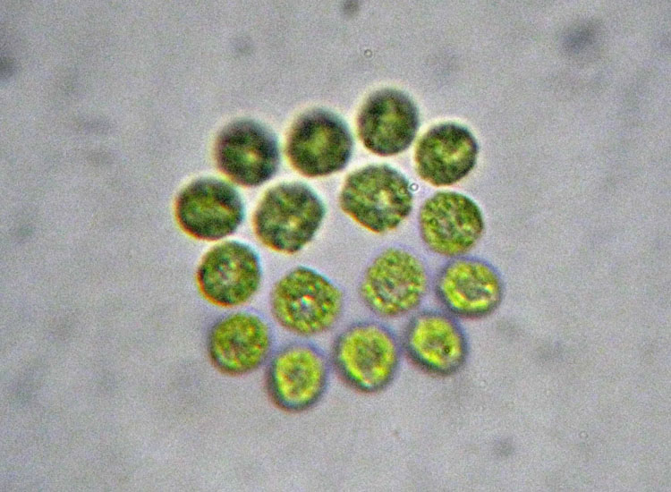 Gonium formosum o pectorale? Propendo per il formosum, basandomi sull'aspetto piriforme delle cellule (perlomeno in certe posizioni) e sull'ampiezza dello spazio tra i due "anelli" interno ed esterno delle cellule.